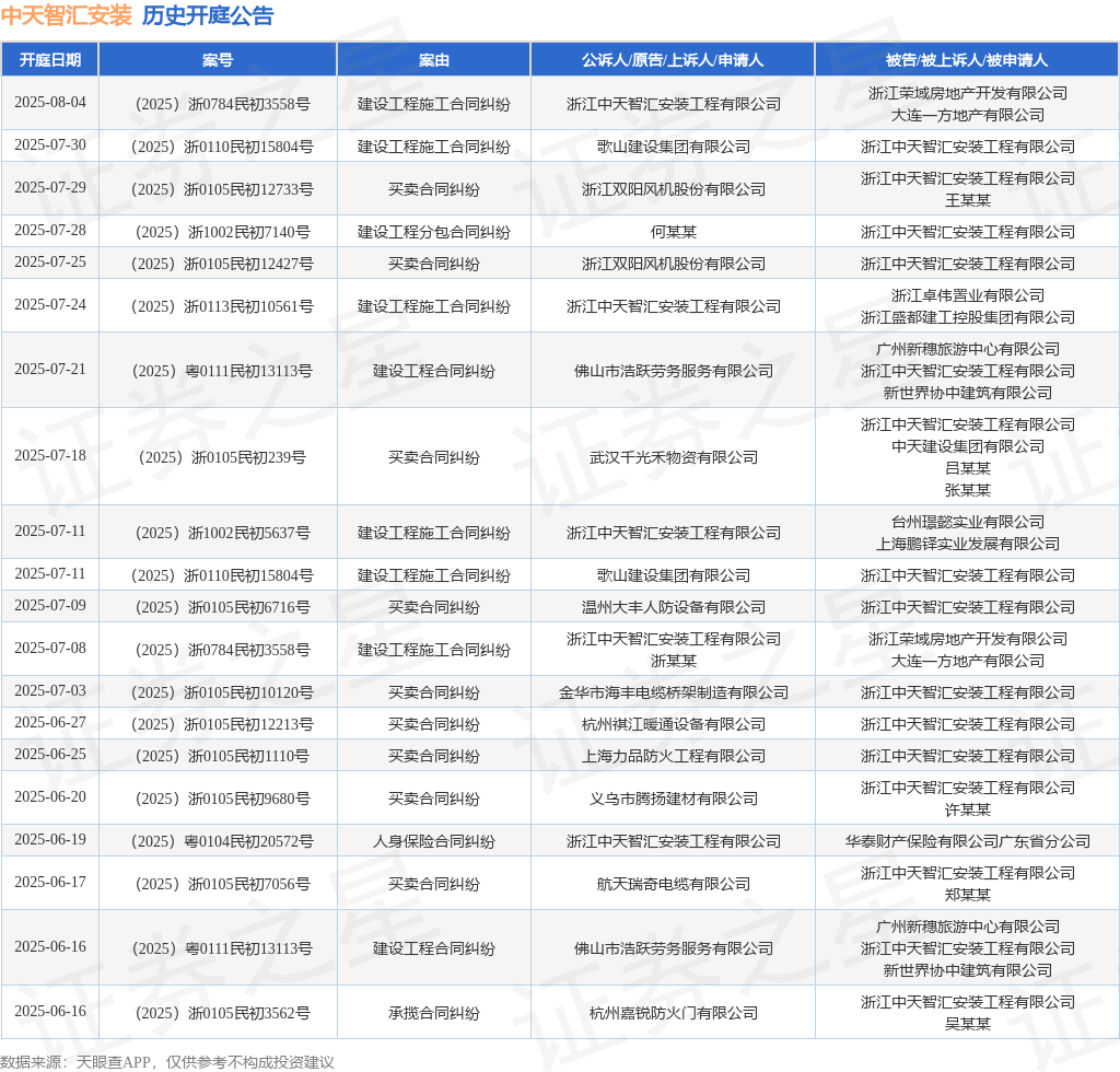本站消息,根据天眼查APP显示,近日公布了一则浙江中天智汇安装工程有限公司作为被告/被上诉人的开庭公告,详细内容如下: