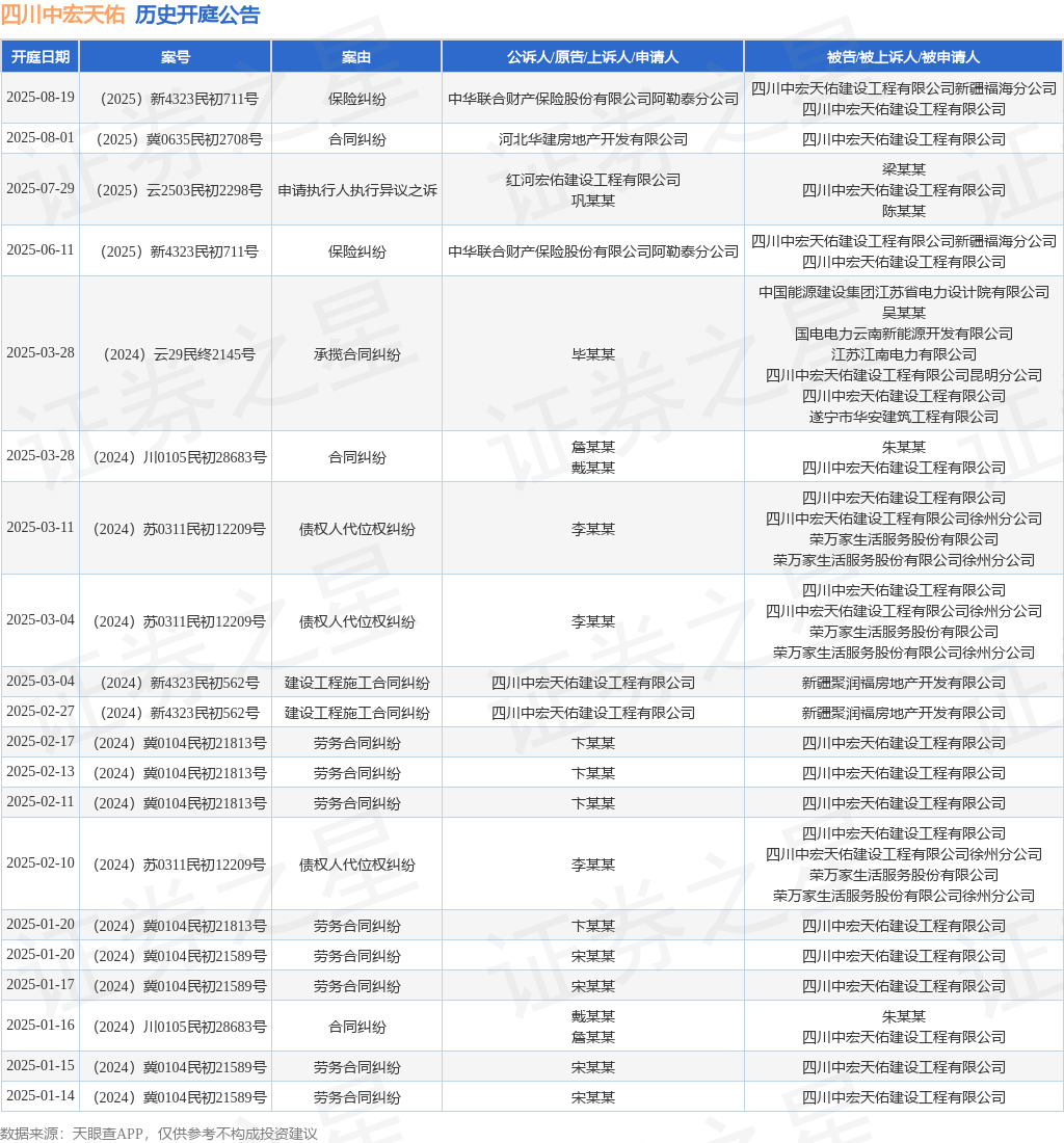 案号:(2025)云2503民初2298号审理法院:蒙自市人民法院案由:申请执行人执行异议之诉当事人信息: 原告/上诉人:红河宏佑建设工程有限公司、巩某某 被告/被上诉人:梁某某、四川中宏天佑建设工程有限公司、陈某某开庭日期:2025年7月29日根据统计,近一年内以四川中宏天佑建设工程有限公司为当事人的历史开庭公告有39则,其中案由为“劳务合同纠纷”的公告以11则居首,其次为“建设工程施工合同纠纷”有10则,“买卖合同纠纷”有4则。历史开庭公告(前20条)如下: