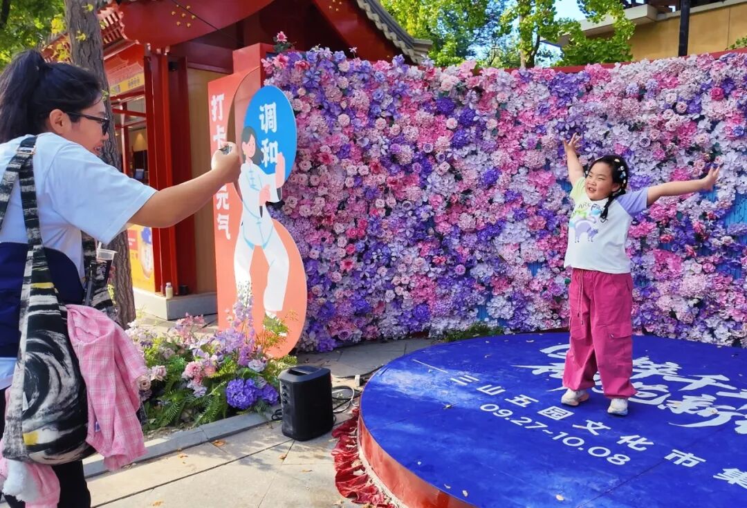 从国旗展板的庄重热烈、国风条幅的典雅大气,到鲜花秋千的温柔浪漫、充满巧思的金黄南瓜、元气满满的八段锦舞台,再到花漾璀璨的圆月、惟妙惟肖的风筝......同庆街将中医养生、非遗文创与国庆氛围完美融合,每一处打卡装置都藏着惊喜,每一个转角都洋溢着欢歌。