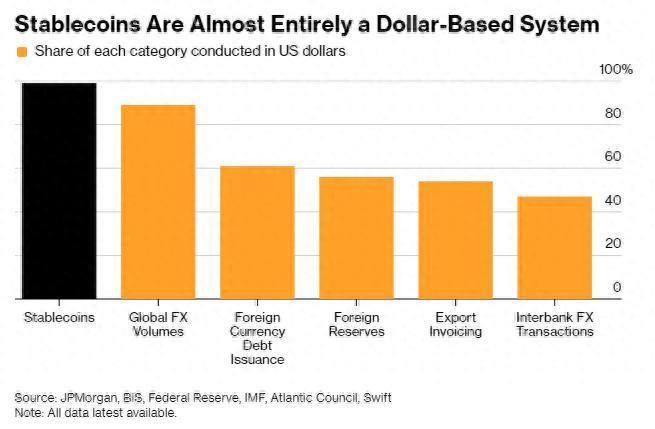 摩根大通策略师估算,目前稳定币总供应量中,约99%与美元或美元底层资产保持1:1锚定。稳定币是由非银行机构发行的一类数字货币,其背后有美国国债及其他大型银行储备资产作为支撑。与比特币等价格波动剧烈的加密货币不同,稳定币的设计初衷是与传统货币(其中以美元为主)保持1:1的价值挂钩。